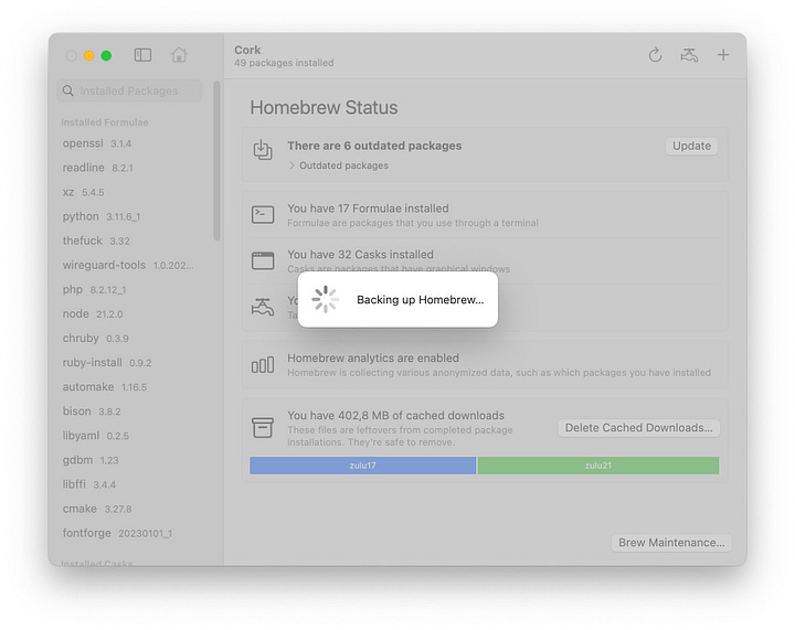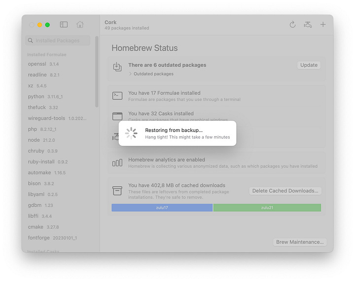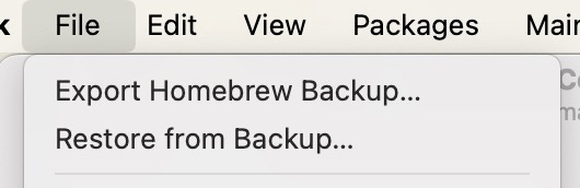 Support for backing up and restoring! You can now back up your installed packages and taps, and restore them when you move to a different computer. The backups are made in a Homebrew-compatible