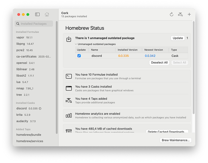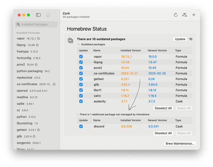 Packages → Show packages not managed by HomebrewOnce enabled, you will start seeing “Unmanaged“ packages in your outdated package list